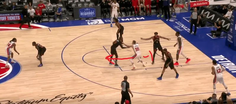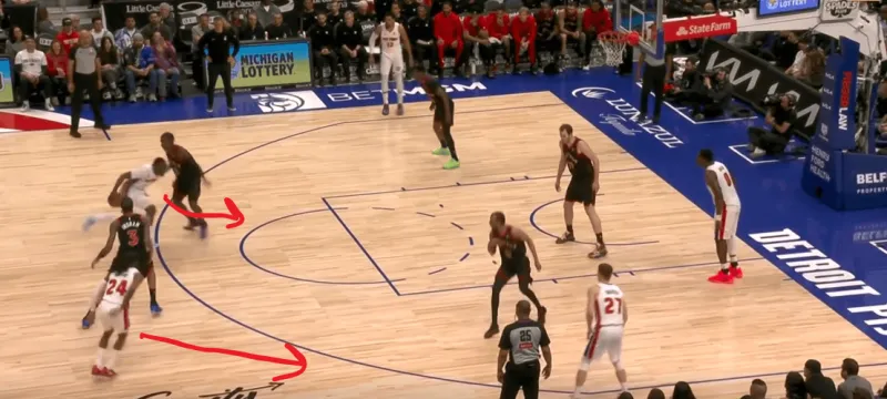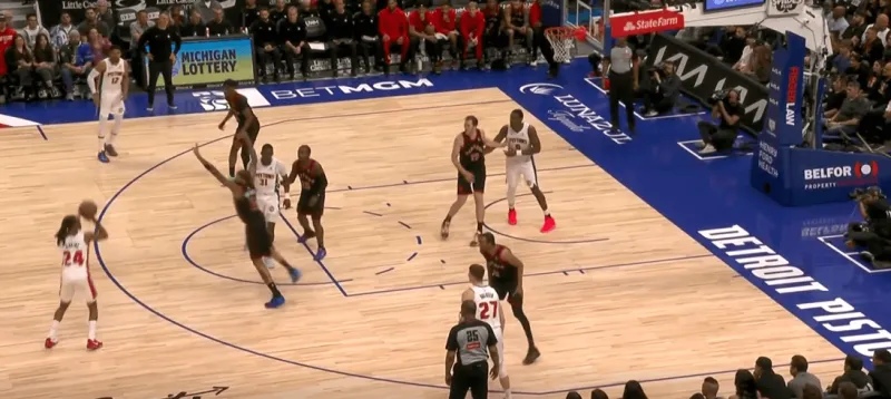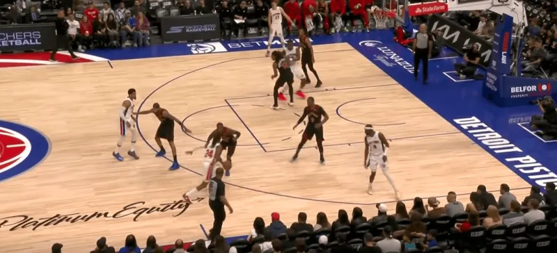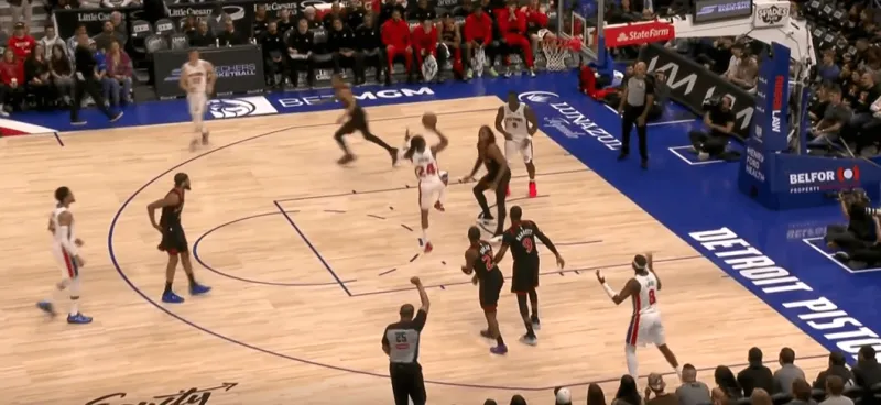 詹金斯和杜伦的掩护后后者快速顺下,珀尔特尔和沃尔特延误詹金斯,这时底线的奥萨向外撤出,slot区的哈里斯同时切入禁区帮助詹金斯和杜伦获得了连线机会,巴恩斯和英格拉姆都在无球端受到干扰,詹金斯得以抓住机会吊给篮下的杜伦: