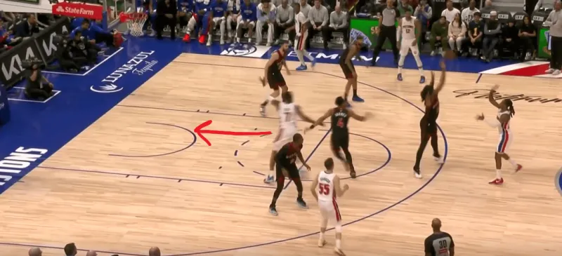 这一次进攻的初始发起应该是邓罗为杜伦做ram掩护,随后在弧顶展开1-5挡拆发起,但巴恩斯和巴雷特的站位使得前置掩护很难顺利进行,邓罗迅速提上做flat掩护后向左横切,詹金斯变向一步直接干拔三分解决问题: